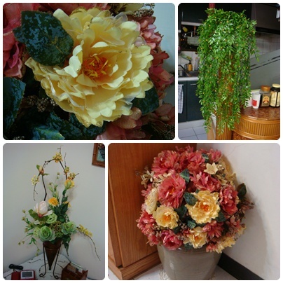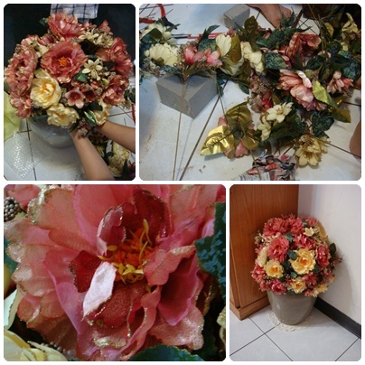 。散落一地的花材跟假花近拍,我覺得還不錯看啦!至於右下角的那一盆是我們努力很久的作品,如果有插花高手,拜託教教我如何調整才會更好看!!如果覺得很醜的,就................愈看會愈好看啦!!。