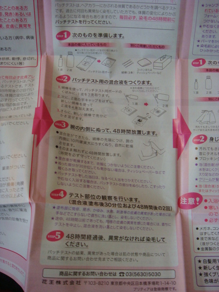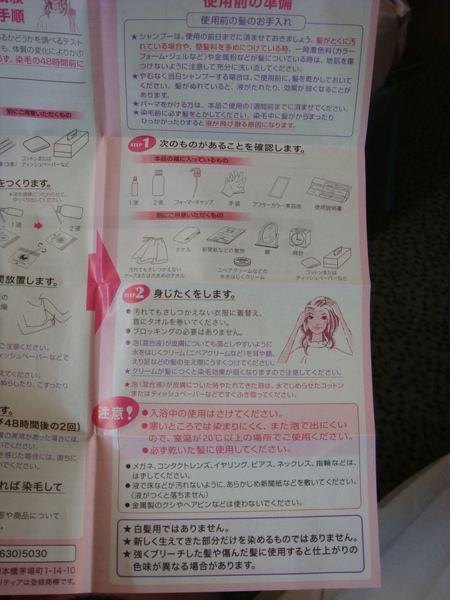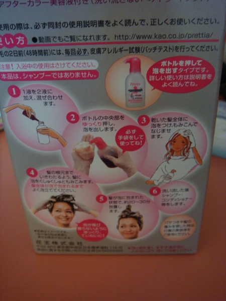 反正我一邊染一邊呱呱叫,誰說這染髮劑不嗆的??我整個嗆到左眼都紅了...眼睛好像快瞎了一樣,呼吸也覺得很嗆,我的肺好像都融化了,而且一開始我還擠不出什麼泡泡,都水水的,很難弄到頭髮上固定住,一直滴滴答答,原本想休息的小王子也一直被我叫起來拿說明書給我看,是說都是日文看100遍還是看不懂,但我就覺得我都有照圖片上做啊,而且看一看心比較安,只是不懂為什麼會搞得亂七八糟...