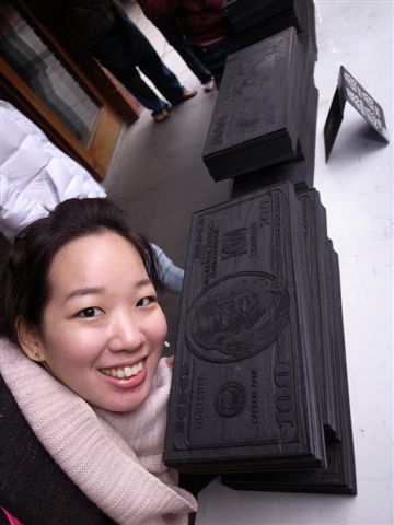 ::傳藝中心有好多小店,我跟嘰咕比走了四、五個小時還意猶未盡,第一家小店是跟炭有關的小店,門口有一大疊用炭做的鈔票::