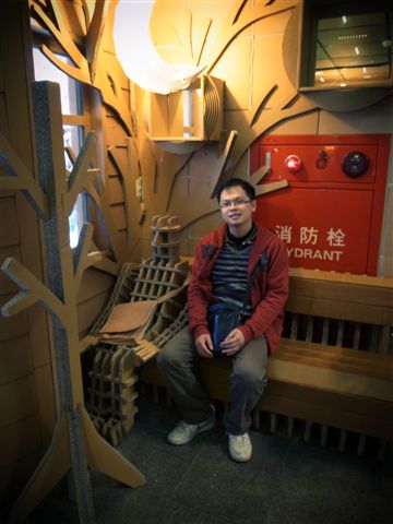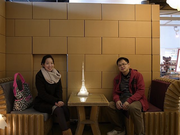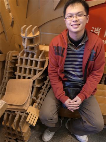 ::我跟嘰咕比坐在紙桌子紙椅子上的合照,紙做的椅子意外的舒服耶~好想回家自己做一個,哈!::