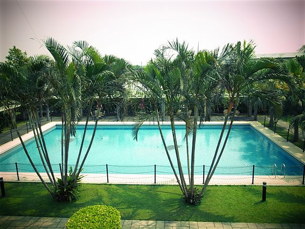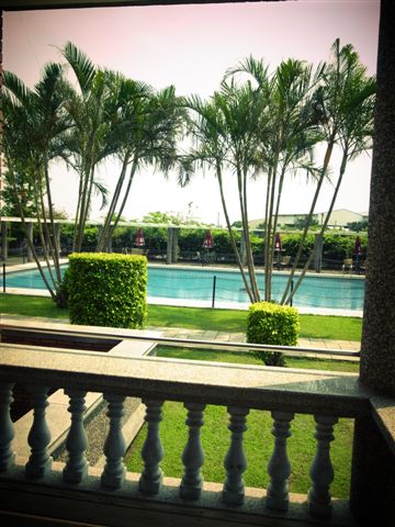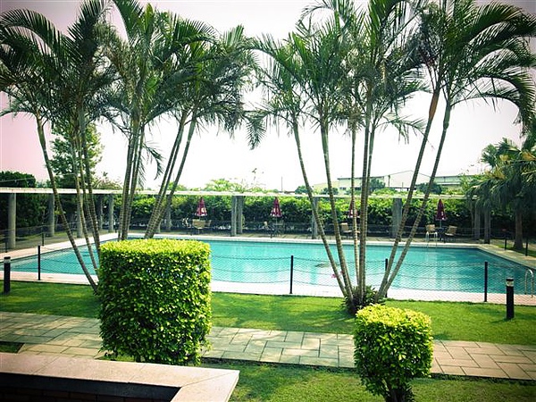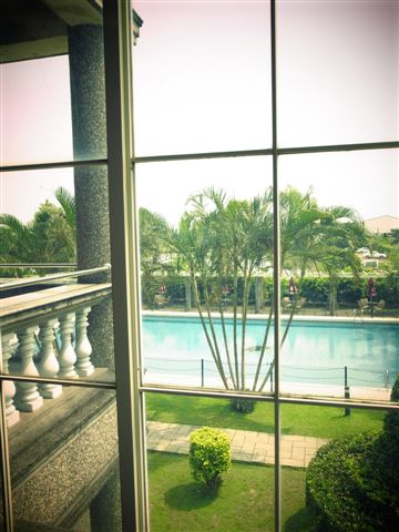 ::咖啡館裡面有小陽台,看出去還有藍藍的游泳池,是不是心情大好?::